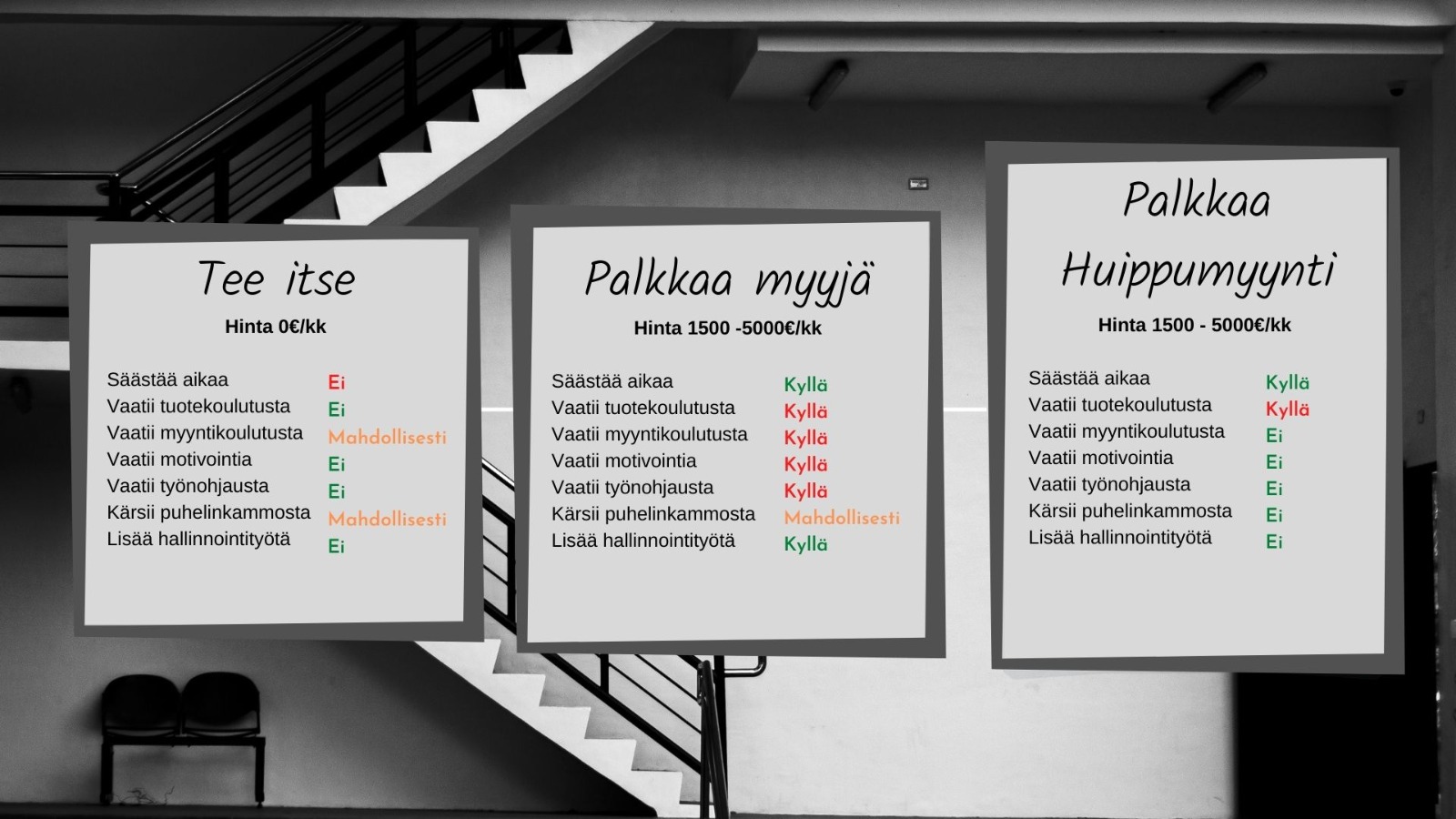 - Yrityksen henkilökunnalla ei ole aikaa tai osaamista myyjän rekrytointiin ja perehdyttämiseen.